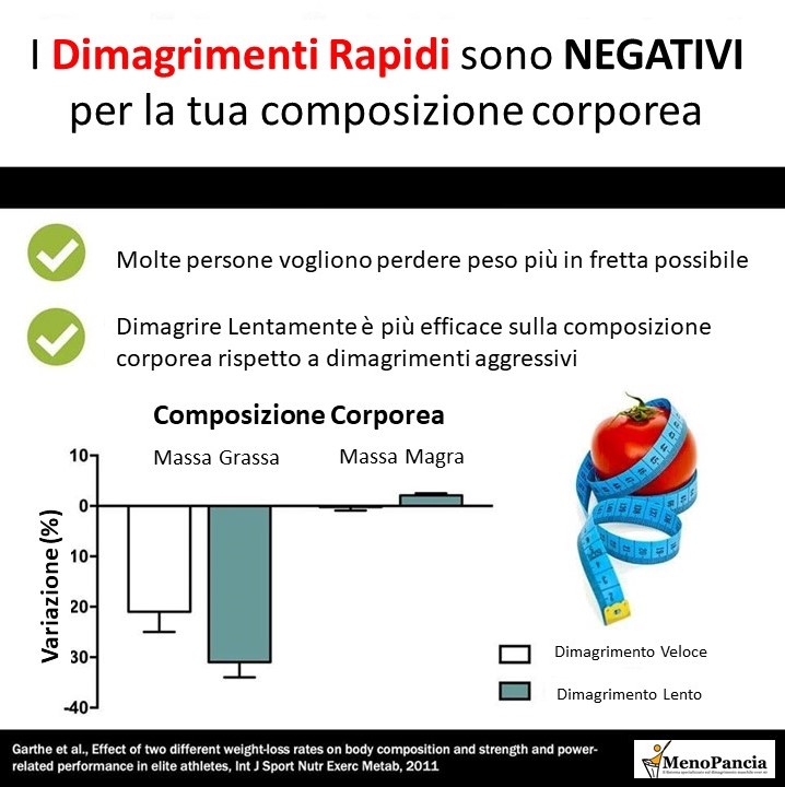 Lo scopo di questo studio era quello di confrontare due tipi di dimagrimento sulla composizione corporea: Uno veloce e l'altro lento. Con lento si intende una perdita settimanale dello 0,7% rispetto al proprio peso corporeo. Con veloce il doppio, ovvero 1,4%. In soldoni, se pesi 100 Kg, con il dimagrimento lento dovresti perdere 0,7 Kg/settimana. Con quello veloce 1,4 Kg/settimana. La conclusione dello Studio è riassunta nel grafico che ti ho riportato qui sopra. Cioè che i soggetti che hanno perso peso lentamente hanno perso più grasso (31% contro il 21%). Visto che i soggetti in questo Studio erano atleti, erano previsti anche allenamenti con i pesi. Grazie a questo, il gruppo facente parte del dimagrimento lento è riuscito a mettere su anche muscoli. Cosa che invece non è successa nel gruppo del dimagrimento rapido. Come puoi immaginare, il gruppo che ha fatto il dimagrimento lento ha avuto più benefici dal punto di vista estetico. Questo perchè ha perso più grasso e guadagnato anche muscolo. E dato che stiamo parlando di atleti, ho come l'impressione che questi risultati siano ancor più amplificati nel caso di soggetti maschili con più di 40 anni. Se consideri inoltre che proprio a partire da questa età c'è un normale calo di Massa Muscolare, il dimagrimento lento è certamente più indicato visto che evita proprio questo. Subito dietro all'alimentazione, il secondo pilastro necessario per stare a 40 e più anni come un ventenne è certamente l'allenamento con i pesi.
