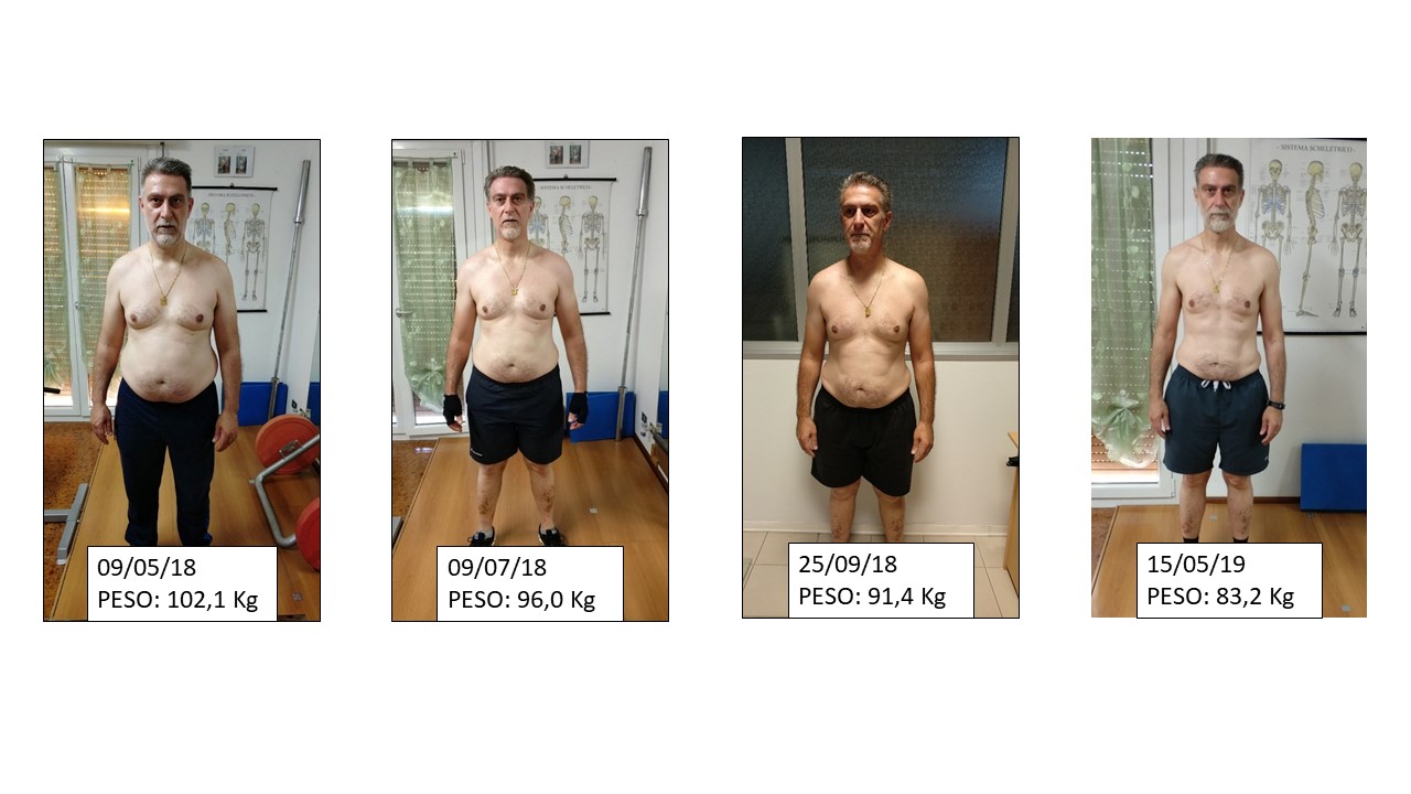 Alcuni esempi di alimentazione che rientrano in questa prima strada sono la Paleo Dieta, La Dieta Vegetariana, Life120 o semplicemente una dieta che esclude i cibi più calorici. Questa prima strada è facile all'inizio perchè non devi stare a pensare. Sai già in partenza che questa cosa la puoi mangiare, quella no, quell'altra si, ecc. Si va per esclusione. Il problema può nascere dopo. Perchè ti ritrovi a mangiare sempre le stesse cose in una società che ti propone infinite prelibatezze alimentari. Le ricerche dicono che queste diete falliscono quasi sempre sul lungo termine perchè non sono sostenibili. E quando molli sfoci nel Binge Eating, ovvero ti ritrovi a fare abbuffate incontrollate come Fantozzi. Quando succede questo il peso schizza alle stelle, e sarà sempre più difficile liberarsene. Quindi quello che devi fare è passare gradualmente alla strada numero 2 prima che ciò avvenga. In cosa consiste questa seconda strada? Lo vediamo tra poco ma prima lasciami fare una precisazione importante. Se ti trovi bene con questo primo approccio, il peso scende senza problemi e ti senti bene, non sei obbligato a passare alla seconda strada. Restaci su fino a quando vuoi, squadra che vince non si cambia. Proprio come ha fatto Davide Dell'Onte. Che con questa prima strada ha perso 18,9 kg e il peso continua a scendere ancora (vedi foto sotto).