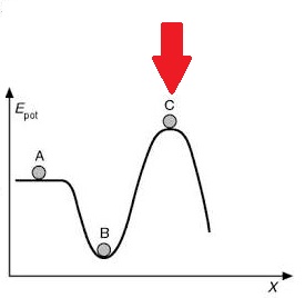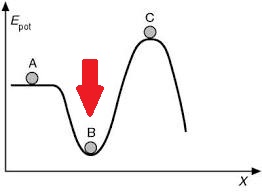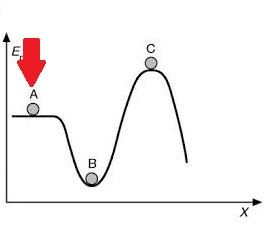 La pallina rappresenta il tuo metabolismo, e quindi anche il tuo potenziale di perdere peso. Il caso di equilibrio stabile è indicato dal punto B con la freccia rossa. Come ti dicevo, è quello più sfavorevole ma anche molto diffuso tra gli uomini con più di 40 anni che vogliono perdere peso. Te ne parlo qui di seguito, seguimi.