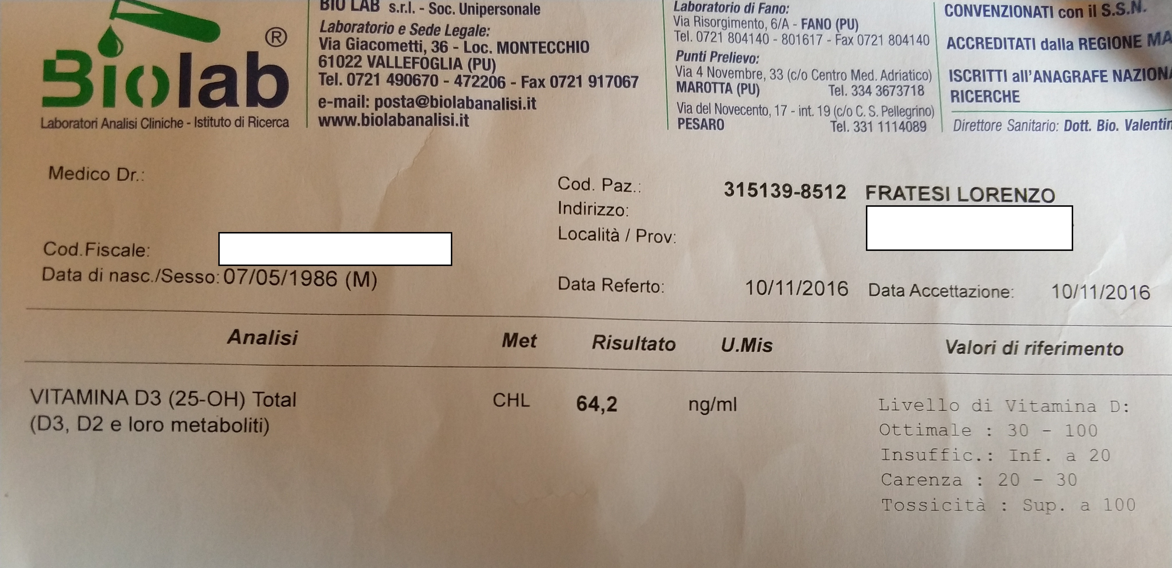 Non sono un fan di pasticche e pillole colorate. Se dovesse esserci l'esigenza di integrare, questa deve emergere dalle analisi del sangue. Ad esempio, oggi va di moda riempirsi di Vitamina D. Esiste un esame specifico che si chiama Vitamina D3 (25-OH) che ti dice chiaramente quali sono i tuoi livelli di vitamina D circolanti. Ebbene, io ho fatto questo Test mediante analisi del sangue, ed è uscito fuori che il mio valore era nella fascia medio/alta dei valori di riferimento, come puoi vedere in figura (64,2 ng/ml dove il range ottimale va da 30 a 100 ng/ml).