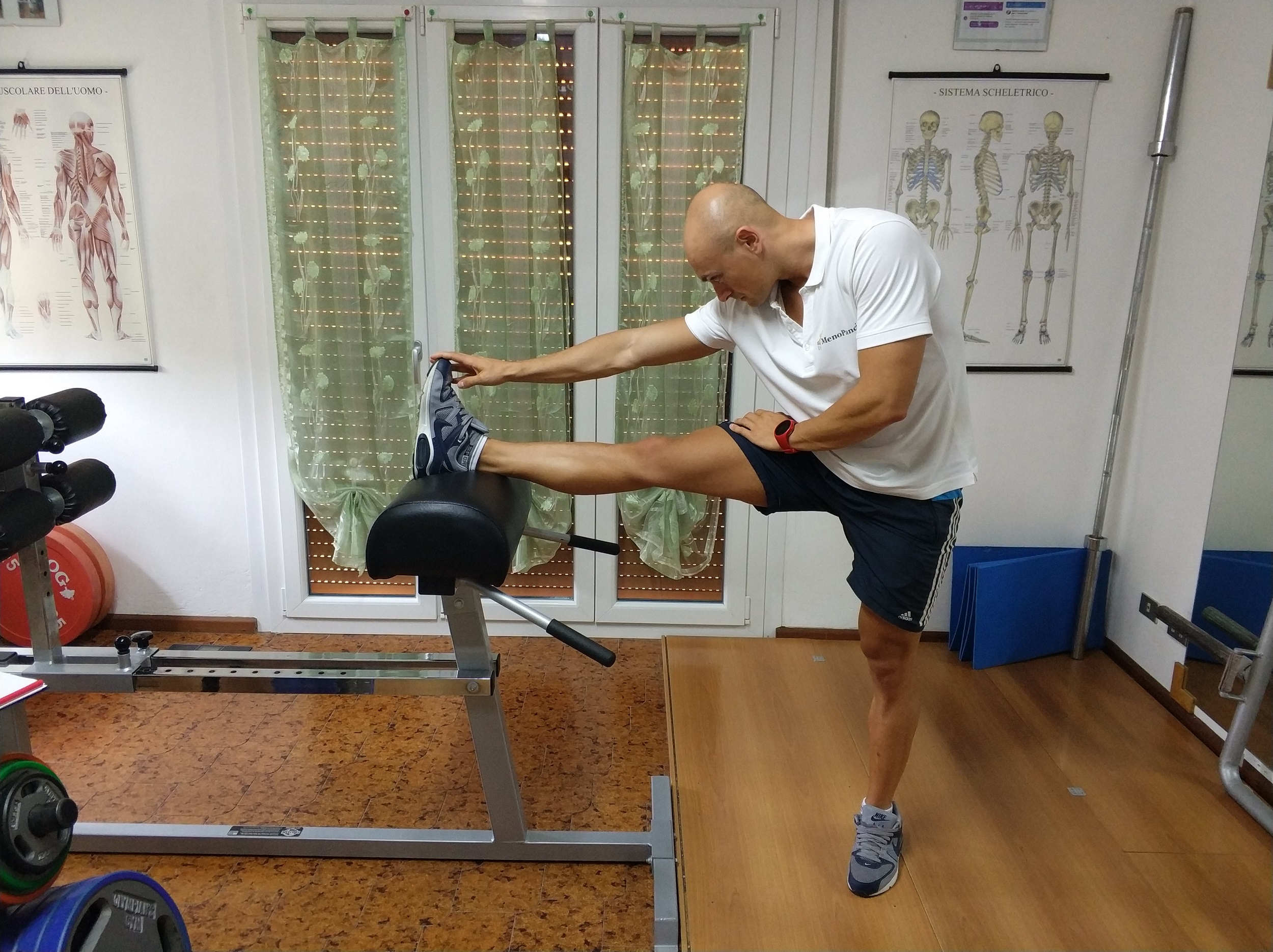 Porta una gamba tesa su una superficie rialzata. Come nella versione da seduto, cerca di raggiungere la punta del piede tenendo la gamba tesa. Se non arrivi alla punta, puoi fermarti con la mano sulla tibia. MUSCOLI ALLUNGATI: Bicipiti Femorali