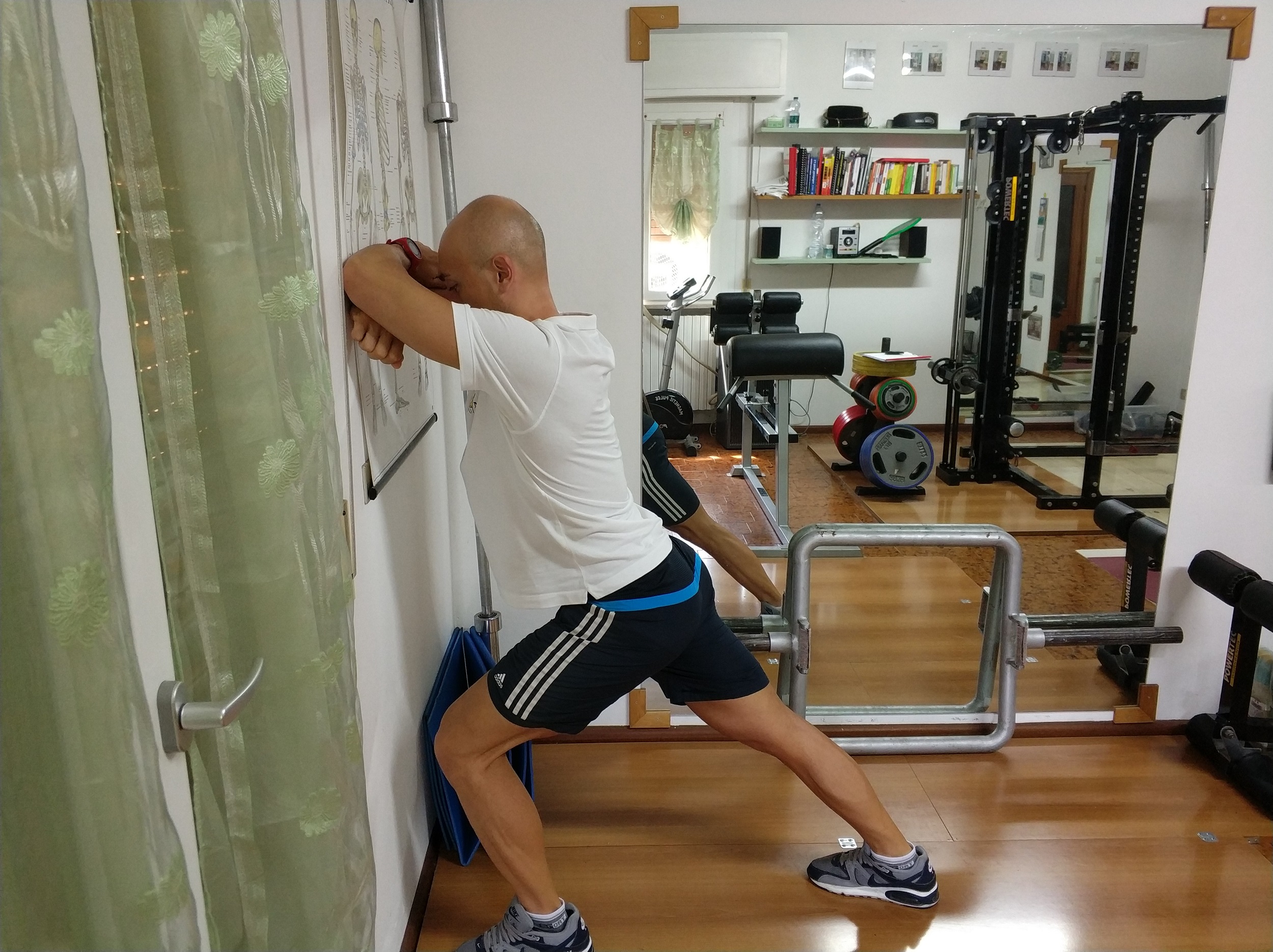Appoggiati su una parete solida con le mani o con gli avambracci. Porta una gamba avanti e tienila leggermente flessa come in figura. La gamba dietro resta tesa e con il tallone ben appoggiato sul pavimento. Puoi aumentare l'intensità dell'allungamento portando più indietro la gamba posteriore. MUSCOLI ALLUNGATI: Polpacci