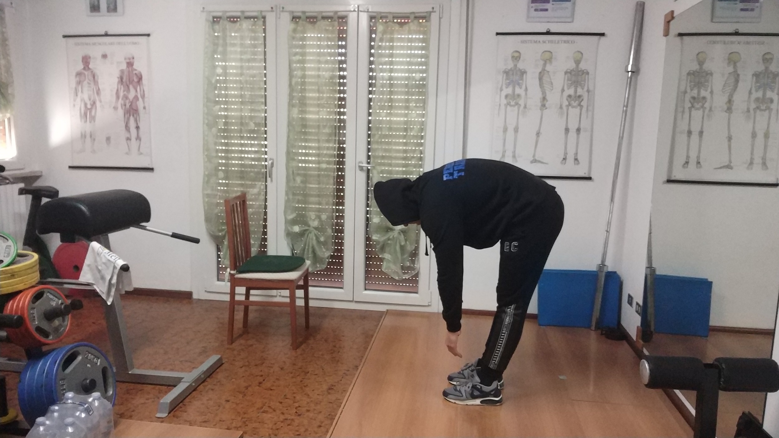 Da in piedi, scendi verso le punte dei piedi mantenendo le gambe tese. MUSCOLI ALLUNGATI: Bicipiti Femorali, Lombari.